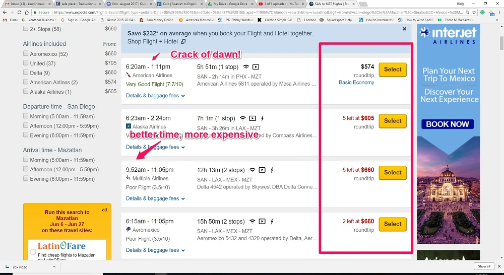 Here are screenshot comparisons of the prices for flights from San Diego to Mazatlán on American carriers vs. the cost of flying from Tijuana to Mazatlán on Volaris with only two weeks lead time to purchase the ticket.